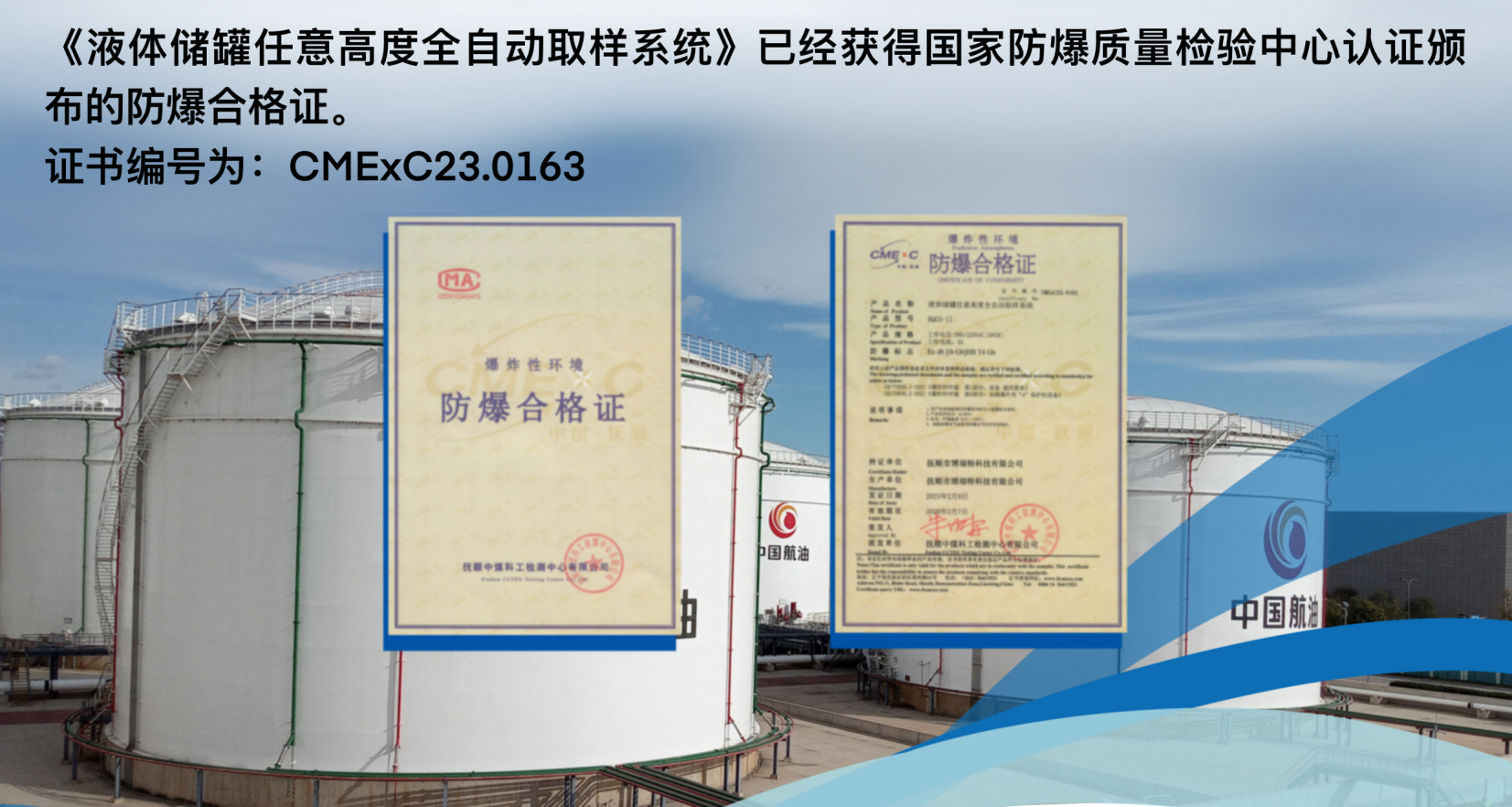 ②2023年9月第三代產(chǎn)品《液體儲(chǔ)罐任意高度全自動(dòng)取樣系統(tǒng)》BQGS-II型4套落地首都新機(jī)場(chǎng)與中航油研發(fā)中心罐區(qū)。