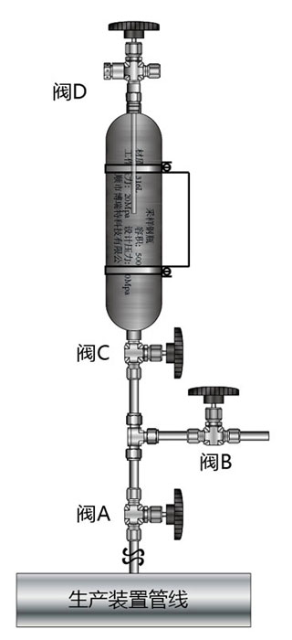 由金屬軟管,快速接頭與閥門組成使用采樣管線將采樣鋼瓶的入口閥C與生產(chǎn)裝置連接好,保證控制閥A、排出閥B 和入口閥C為關(guān)閉狀態(tài)。打開生產(chǎn)裝置的閥門,再打開控制閥A和排出閥B,用試樣沖洗采樣管線。